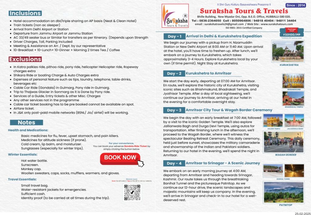 This 10-day Kashmir tour by SuRaksha Tours & Travels is ideal for those seeking a spiritual and scenic retreat. With inclusive travel, food, and accommodation, this package ensures a convenient and memorable journey across northern India’s most iconic locations.
